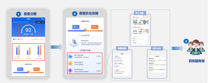 给大家展示店铺分的初衷是希望大家能提升店铺分,分数低并不可怕,只要能找到关键问题从而想办法提升即可。因此请大家谨记“两查看、一问询”的操作准则,在了解到店铺分整体情况后,针对低分模块可先仔细研究优化攻略,服务商还可提供进一步的运营指导,提升效率。